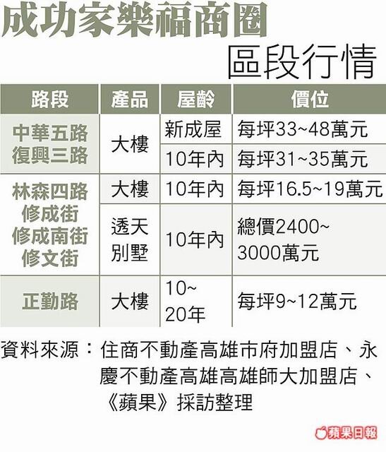 該區因鄰近市府規劃的亞洲新灣區,與統一夢時代3期開發案,周邊房價逐年上揚。區內產品類型不同總價落差大。首購族可選林森四路沿線2~3房產品,總價450~650萬元。換屋族選修成南街周邊透天,主力總價2500~2800萬元。