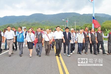 縣長傅崐萁(中)與上百位村民齊從橋東走到橋西,一步一腳印「驗收」新橋。