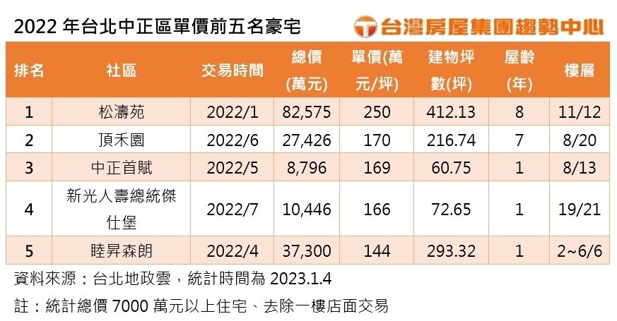 台灣房屋集團趨勢中心統計實價登錄,2022年台北市中正區豪宅單價前五名社區,第一名由「松濤苑」11樓戶,單價250萬元拿下,也是前五名當中唯一單價破200萬元;第二名為「頂禾園」8樓戶,單價170萬元;第三名是「中正首賦」8樓戶,單價169萬元。而「新光人壽總統傑仕堡」社區則排名第四,「睦昇森朗」的144萬排名第五。