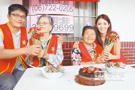 有別於媒體上火辣裝扮,昨天拐拐淡妝出席,幫阿嬤量血壓、餵麵線、還一起切蛋糕,雖然一個國語、一個台語有些雞同鴨講,阿嬤還是笑得很開心,不但誇她漂亮,還感嘆「如果有孫女,應該也這麼大了」,快樂的氣氛中帶點感傷;拐拐則呼籲大家多關心身邊的老人家。