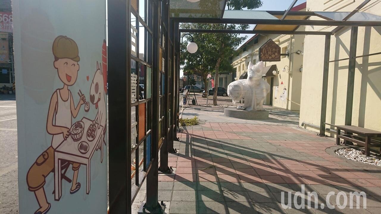彰化縣百寶村及周邊相關休憩設施工程可望3月底完工,大型公仔已經放在人行步道區。記者簡慧珍/攝影