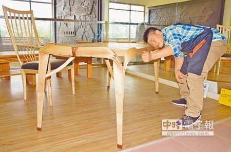 呂岳軒說,作品「誘惑」是由桌、椅各一張所組成,選材自彈性較佳的楓木,桌腳、椅子扶手部分,將楓木切片,經過2小時蒸軟,再彎曲黏貼疊製而成。