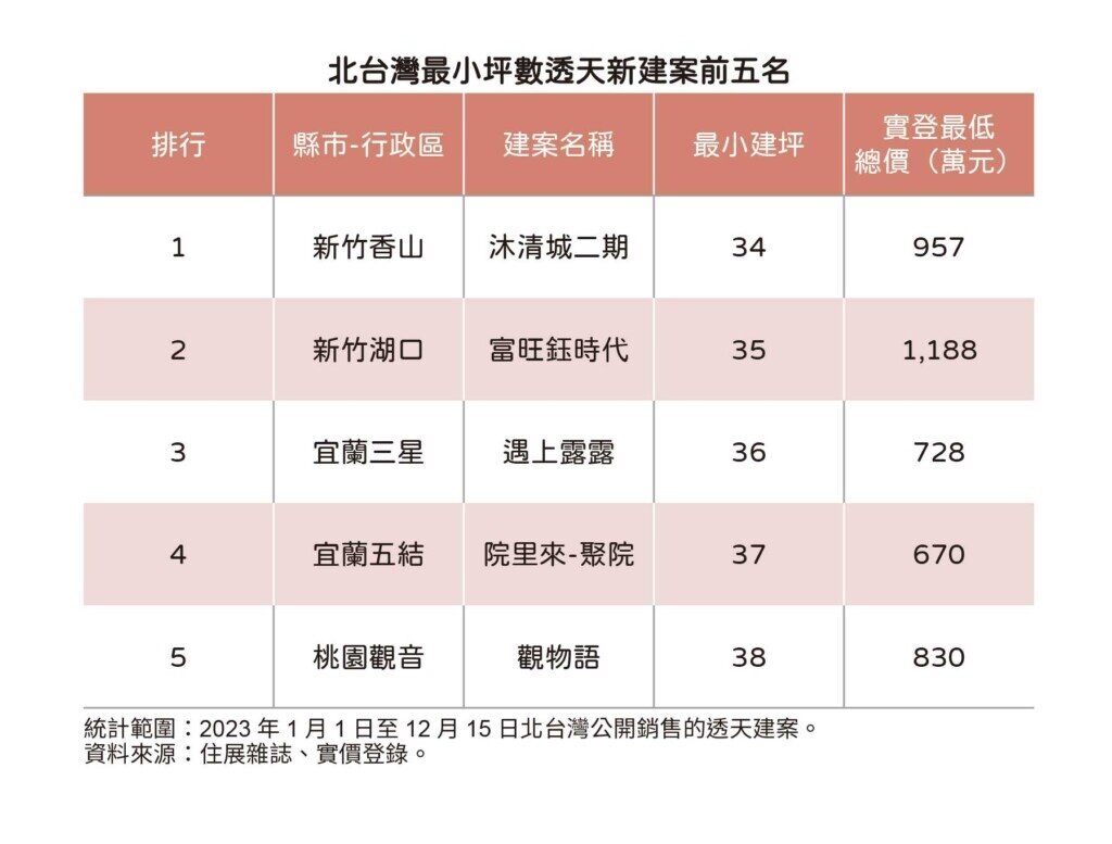 根據實價登錄揭露,截至今年12月15日,北台灣透天最小建坪排行中,建案成交總價從低至高,依序為宜蘭五結「院里來-聚院」670萬元、宜蘭三星「遇上露露」728萬元、桃園觀音「觀物語」830萬元、新竹香山「沐清城二期」957萬元,以及新竹湖口「富旺鈺時代」1,188萬元。