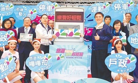 即日起全市各區公所、戶政事務所、產業局、建管處等規費開放使用悠遊卡繳交,市長郝龍斌(中右)及悠遊卡公司董事長張家生(中左)等來賓一同啟動。(王英豪攝)