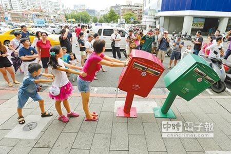 位於北市中山區龍江路上的1紅1綠郵筒,這兩天在臉書上爆紅,歪著頭的樣子,被網友暱稱史上最萌的郵筒,昨天風雨漸歇後,民眾蜂擁而至拍照,人潮在下午3時達到顛峰,一度佔據一個車道,中華郵政甚至圍起紅龍,派員引導。