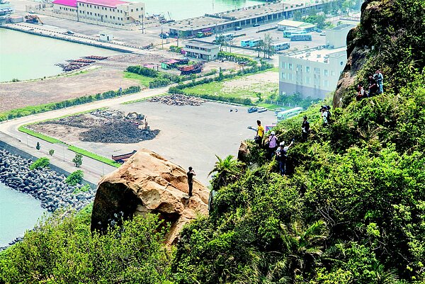 地質研究人員前往基隆北寧路上方邊坡處探勘巨石。 記者黃士航/攝影