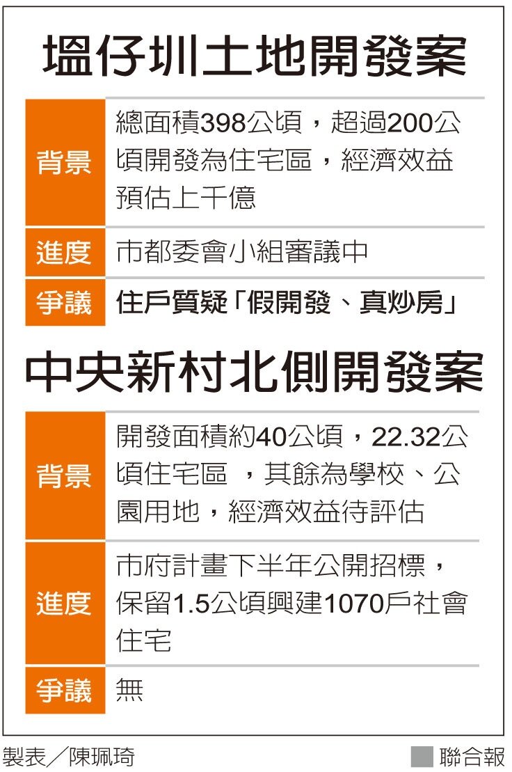 據了解,塭仔圳公辦重劃面積近四百公頃,其中二百多公頃要蓋房子,依附近新建大樓每坪售價超過四十五萬元行情,塭仔圳開發經濟效益預估上千億。