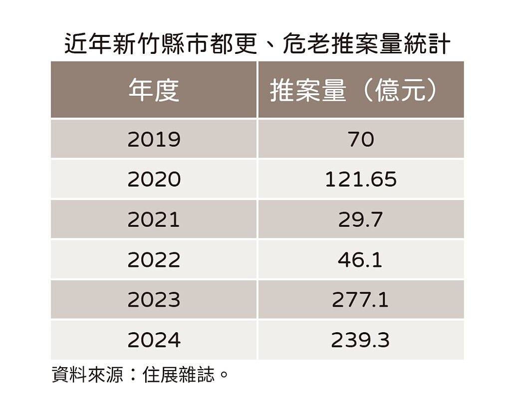 住展雜誌發言人陳炳辰表示,出於新竹核心區房市發展強勁,素地已漸稀缺,建商看準重建商機,都更危老推案量走高,據住展雜誌統計,新竹縣市在2023年推出21個都更危老案,推案量277.1億元,來到史上高點,年增更達500%,可謂一飛衝天。而2024年小幅下修卻仍在高水位,推出17案,案量總計239.3億元。
