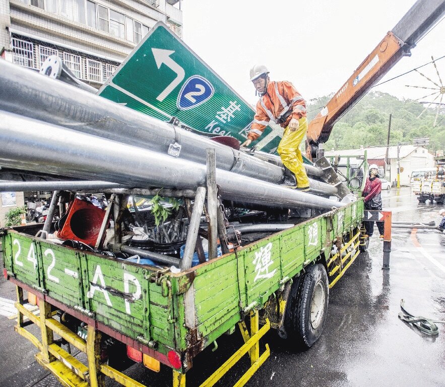 蘇力颱風造成汐止區許多路燈、紅綠燈、公路指示牌倒下。 (記者黃士航/攝影)