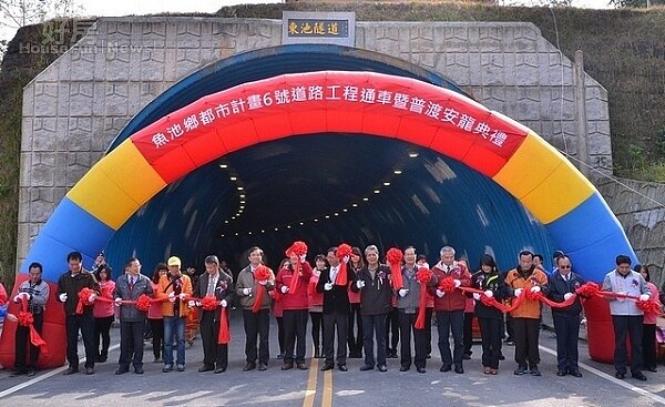 歷經20幾年規劃、耗資1億7千萬元的魚池鄉都市計畫6號道路,於日前正式舉行通車典禮,將可使台21線進入風景區之車流避開魚池市區,縮短九族文化村與市區間之行車時間,抒解市區交通壅塞問題。縣長李朝卿、縣府秘書長陳朝旺等和8對結婚60年夫妻一起走過6號道路「東池隧道」,還有宮廟陣頭參與,相當熱鬧。