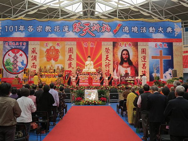 花蓮縣府1日舉辦為期八天的「101年各宗教祭天祈福暨遶境活動」,上午由縣長傅崐萁率領副縣長蔡運煌、縣府各局處首長,以及福安廟、帝君廟等廟宇主委,在六期重劃區設置的祭壇,依傳統道教三獻吉禮及叩拜大禮儀式,祈求國泰民安、風調雨順。下午則在花蓮小巨蛋舉辦開幕典禮,展開連續八天七夜的全縣遶境活動。