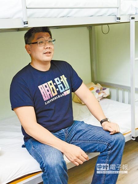 連勝文18日至北投的國際青年旅舍,與在地青年創業家探討如何發展觀光,而連勝文的高大體型,讓他在試床墊舒適度時,一時興起的以頭部頂著上舖。(記者杜宜諳/攝影)