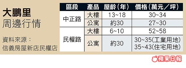 信義房屋新店民權店專員張宜瑞表示,「大鵬華城」因為社區規劃良好建立口碑,吸引許多家中有長輩,或是大家庭的購屋人指名購買,電梯大樓每坪30~40萬元。