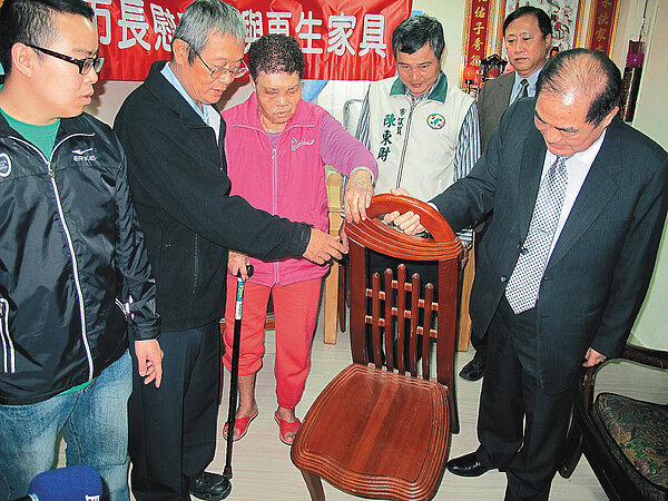 基隆市長張通榮(右)昨天將環保局的再生家具送給低收入戶,表達關懷。(圖/阮南輝攝)