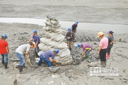 台電動員人力為日月潭九蛙疊像清淤,也凸顯乾旱嚴重!(廖志晃攝)