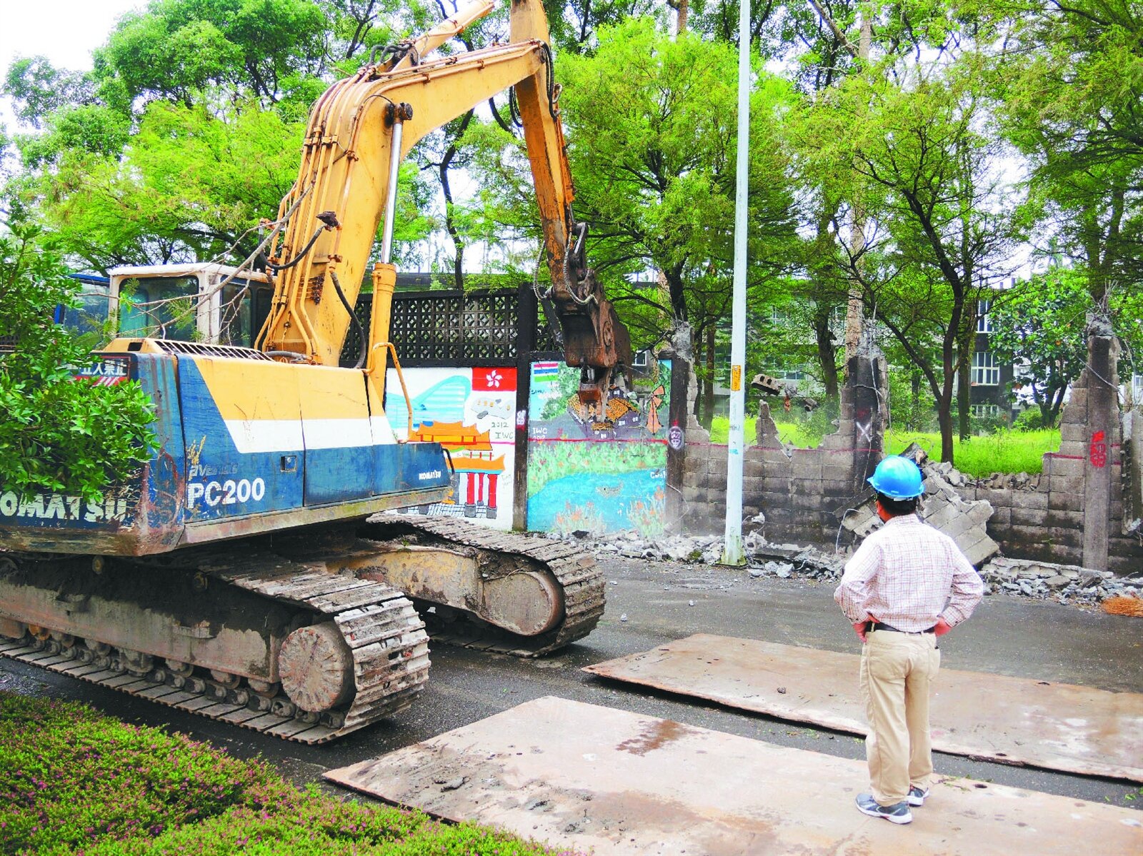 昨廠區開始進行拆除作業,圍牆高度減半後,路過民眾都能一睹湖區風光。(記者林縉明/攝影)
