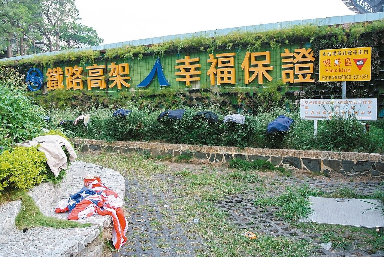 台中舊站廁所旁的吸菸區,變成遊民的曬衣場,內褲、上衣直接掛在樹叢上晒,地上四處都有菸蒂、垃圾,遊民自在坐在石頭上聊天,呈大字型睡覺,舊站的吸菸區就像遊民的家,一般民眾不敢靠近。