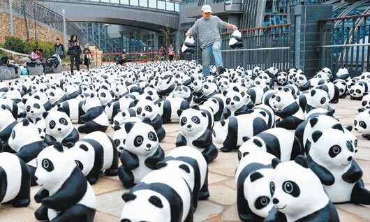 台北市政府主辦的紙貓熊展即將在本月廿八日登場,紙貓熊們昨天到捷運大安森林公園站下凹庭園廣場「快閃」,為展覽暖身。 (擷取自udn聯合新聞網)