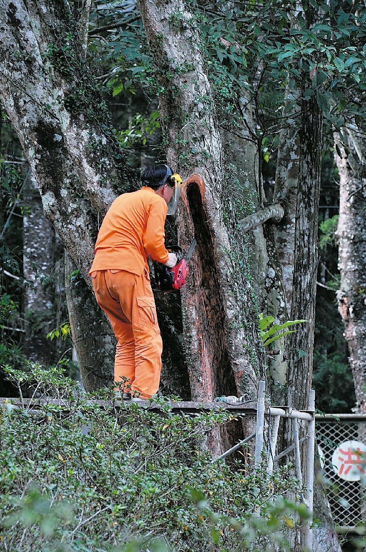 蓮華池研究中心副研究員傅召憲說,樹木專家逐一為生病樹木健檢診斷,其中3棵光蠟樹適度修剪後增設支撐結構;另4棵光臘樹稍有腐朽樹高傾斜等,處理腐朽部分,考量立木環境與樹高因素適度修剪保存下來。但有兩棵光臘樹已腐朽死亡,昨天伐除,將再種植新的本土樹種。