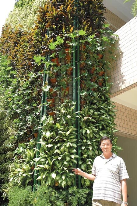 碳中和社區中山區劍潭里里長畢無量,帶領社區志工打造「綠建築」里民活動中心,「植化牆」與「綠屋頂」經實測可有效降低室內溫度。(江慧珺攝)