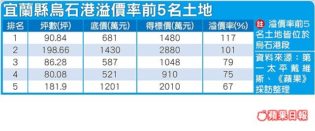 宜蘭建地如此搶手!昨天57筆宜蘭縣烏石港土地公開競標全數標出,現場吸引近500人,其中有206人參與競標,競爭激烈。57筆土地全部標脫,得標總價為17.2億元,較底價11.9億元,多出5.3億元,溢價率42.95%。57筆土地只有1筆為商業區,其他皆為住宅區。現場將7標標售底價超過5000萬元土地作密封投標,剩下30標以現場舉牌方式競標。競標會場不時出現投標者舉牌、並大喊加價聲,擔任競標官的第一太平戴維斯副總經理邱奕平,也不時鼓吹投標者加碼,現場氣氛熱烈。