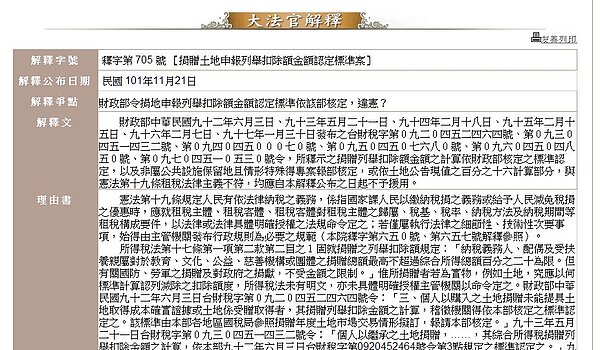 現行「捐地抵稅」,如果土地無法取得成本證明,且不是屬於公共設施保留地,依照財政部六則函示規定,一律依公告現值十六%計算捐贈列舉扣除額,但大法官會議廿一日作成釋字七○五號解釋,認為違憲,不符憲法租稅法律主義,宣告即日失效不再援用。