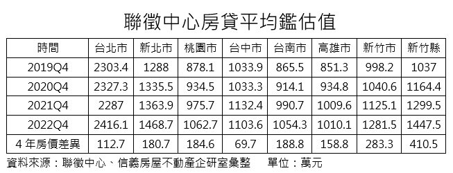 統計顯示,房價增加金額最多的是新竹地區,新竹縣去年第四季房貸的平均房價鑑估值為1447.5萬元,相較於4年前增加411萬元,新竹市則是增加283.3萬元,但新北市、桃園市、台南市4年房價增加180餘萬元,不過雖然房價增加金額相似,但桃園、台南與高雄房價基期較低,都是從800餘萬元,4年時間就衝上千萬元的房價,相對房價漲勢更為明顯。