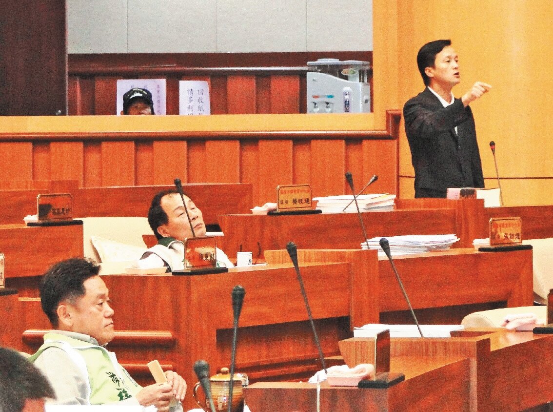 基隆市議會昨天臨時會針對警力支援立法院學運引發熱烈討論,議員藍敏煌(右一)與議員游祥耀(左一)發言擦槍走火,一度針鋒相對。(記者游明煌攝影)