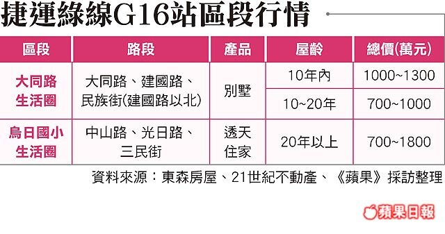 邱志偉分析,捷運綠線G16站周邊以建國路北側的大同路交易量較大,區內以屋齡10年內、地坪18~28坪、建坪45~55坪、面寬4.5米社區型中古別墅為主,主力總價1100~1300萬元,分布在大同路、建國路、民族街等路段,其中以景棠建設興建的社區最多,總戶數超過200戶。
