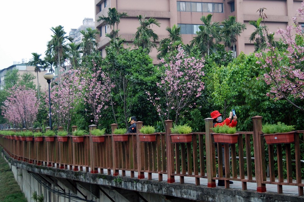 從捷運海山站3號出口直走即為希望之河賞櫻步道,吸引不少民眾前來賞花、拍照。(圖/土城區公所提供)