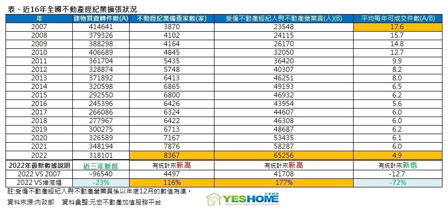 以內政部數據來看,近16年來全台經紀業備查家數狂增近4500家,受僱的業務人員也增加近4.2萬人,增加幅度都超過100%,成長幅度相當驚人,但如今每年的建物買賣移轉量只剩下30萬件初頭,跟十多年前每年約40萬件左右相較,交易量能明顯大減。
