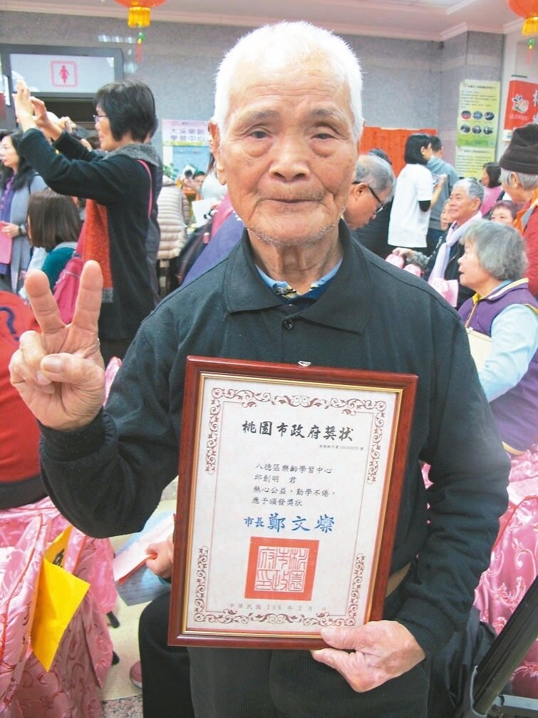 「老了以後才享受學習的樂趣,人生更有意義」,高齡87的邱創明,昨天從市長鄭文燦手中接過「勤學貢獻獎」,臉上洋溢開心笑容。他完全不識字,拉拔孩子成家立業,以高齡81歲到樂齡當學生及志工,老當益壯開啟幸福人生下半場。