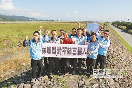 宜蘭縣國民黨各級候選人昨到三星鄉紅柴林堤防,高呼「還我貴連大橋!」質疑縣長林聰賢政策跳票。