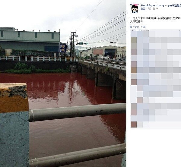 泰山區貴子坑溪前天下午遭不明廢水染成「紅河」(圖取自yes!!我愛住泰山臉書)