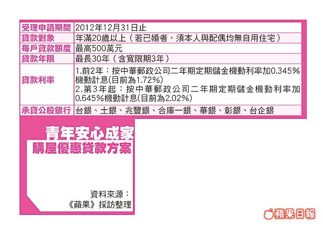 由8家公股銀行辦理的「青年安心成家購屋優惠貸款」,申貸對象為年滿20歲、本人及其配偶均無自用住宅,且為「首次」購屋者。此優惠貸款核貸成數為8成,最高可貸500萬元,為政府各項優惠房貸中補貼額度最高。前2年利率為年息1.72%,第3年起為年息2.02%起,貸款期限可長達30年(含3年寬限期)。