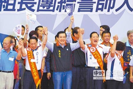 國民黨主席、總統馬英九(中)1日到竹市參加團結誓師大會,為尋求連任的竹市長許明財(右二)拉抬聲勢。