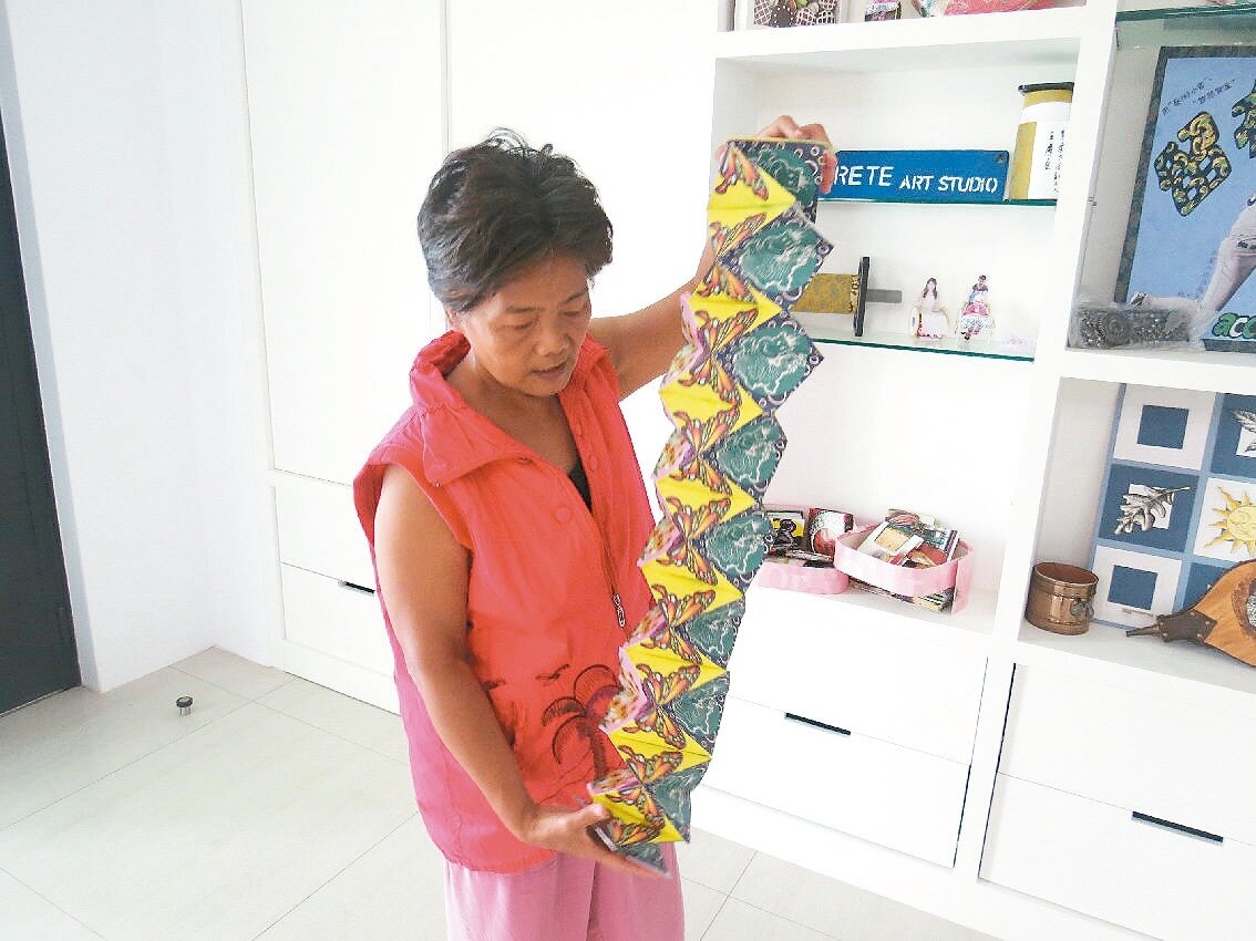 踏進工作室,抬頭可見天花板的「巨大蛋糕」,是她與女兒的創作,用寶特瓶、廢紙、落葉等製成巨型吊燈,取名「天花板上的大蛋糕」,展示櫃也擺滿各式手工書,一本本別出心裁的心情日記,都像她人生的剪影。