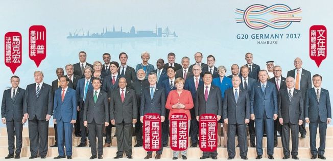 這次合照的中心人物是東道主德國總理梅克爾,兩邊是主辦下次峰會的阿根廷總統馬克里,以及上次峰會主人中國大陸國家主席習近平。