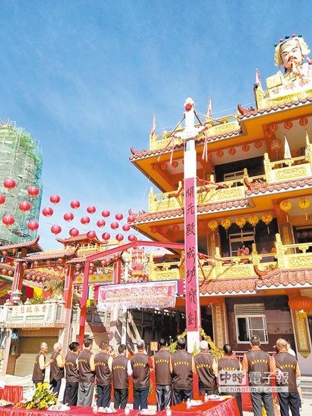 溪口鄉開元殿繼1995年興建全球最高鄭成功大神像,歷經20年募資終於配建81尺高陪祀萬禮、甘輝將軍,11日年度大齋法會舉行前夕,以鋼材打造、高42尺的萬禮成功寶劍亮相,主委許光安表示,這把巨劍氣勢驚人,能出鞘、入鞘,堪稱「東南亞第一劍」。