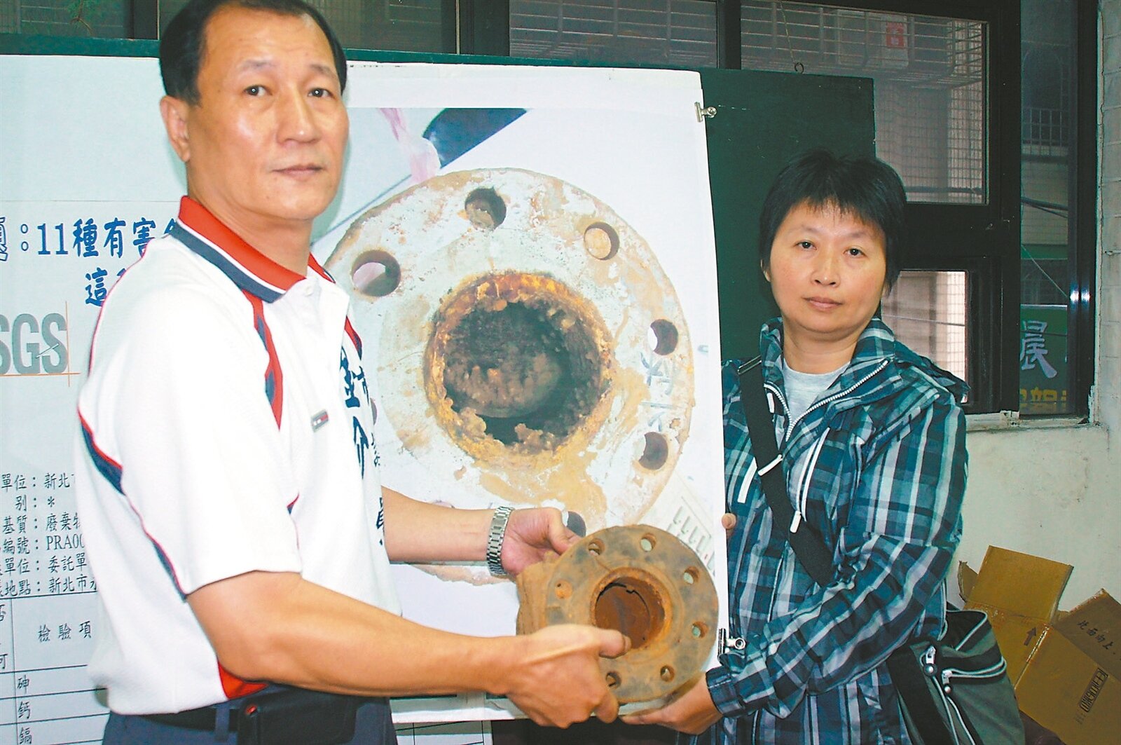 周姓社區副主委(右)表示,自來水逆止閥內長滿水鏽及大如拳頭的管垢。