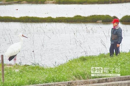 金山小白鶴昨早返回金山濕地,看到熟悉的老農開心展翅。喜愛小鶴的鳥友擔心小鶴沒多久又跑來都市「探險」,可能會有安全問題,希望政府能儘快做出配套,勿讓金山小白鶴成為「阿河第二」。