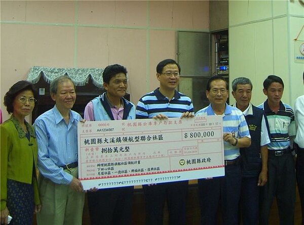 縣長吳志揚17日至大溪頒發八十萬元補助款支票。(記者陳威佑攝)