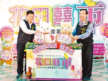 竹北市農業產業文化活動「花田囍市」進入第五屆,市長楊敬賜、市代會主席林啟賢廿三日在造勢記者會中,介紹今年活動吉祥物「草泥馬」,邀民眾十二月一日來賞花、焢窯、騎鐵馬,一起與「草泥馬」遊花田,度過美麗悠閒的假日時光。