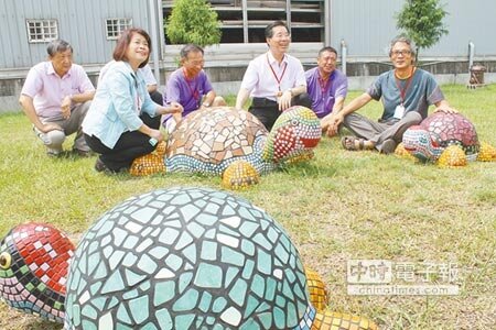 秀水鄉曾厝村是馬賽克的故鄉,拓展文教基金會結合在地陶藝李淳雄(右一),打造了結合陶藝、馬賽克的小公園。(記者吳敏菁攝)