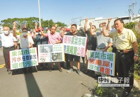 「以鄰為壑、荼毒百姓!」台中市果菜市場任意將未經處理的汙水排放到排水溝,造成惡臭沖天,水果箱、保麗龍等廢棄物阻塞水溝,馬路空水果箱到處堆積等,附近居民長年飽受其害,10日發動前往抗議;要求盡速改善,否則將把果菜市場趕出港尾里。