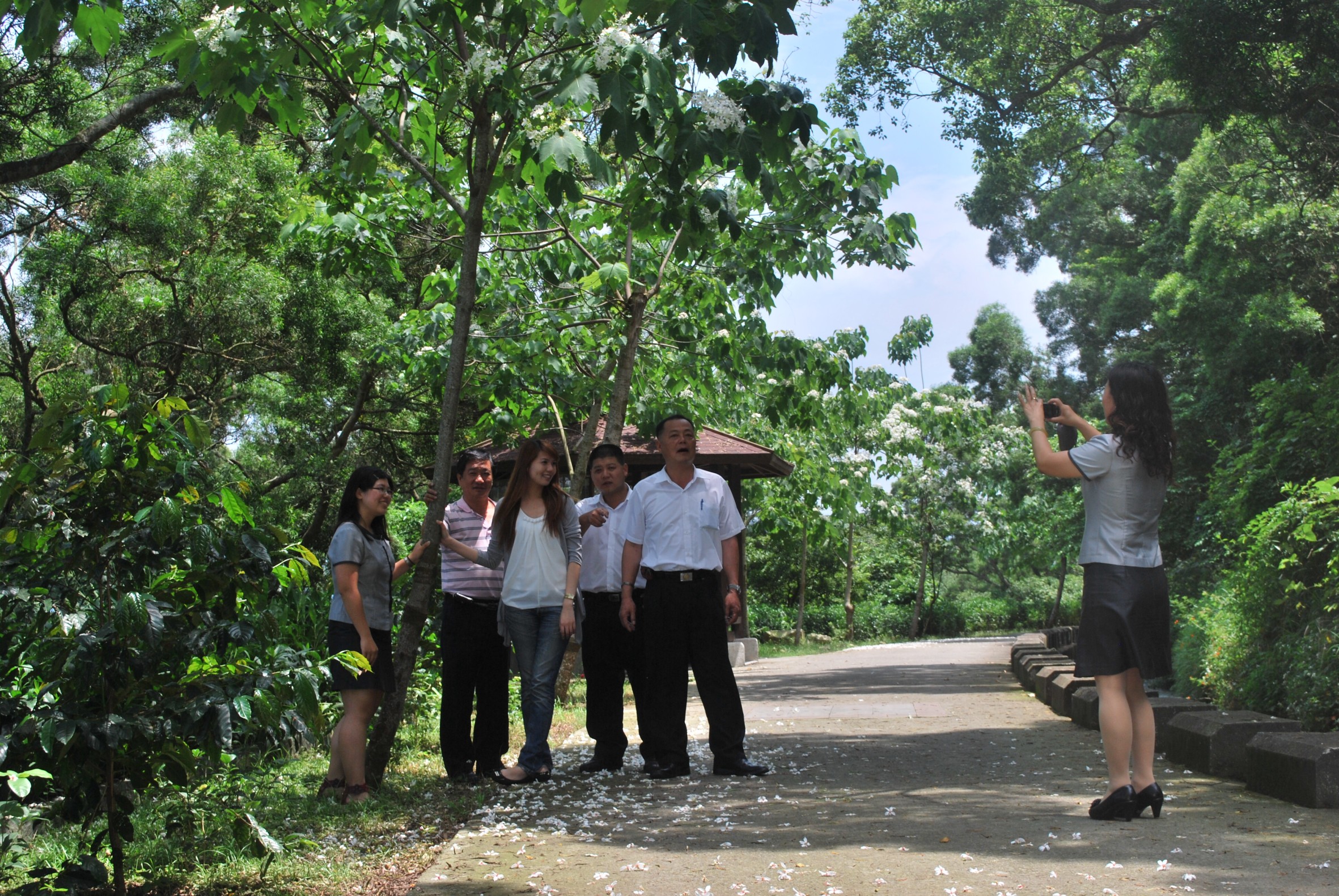 時下已有三分之一強的白色油桐花怒放,隨風飄落、有的隨圳水飄流,煞是美麗。如雪的油桐花樹群,每天除晨昏有區民運動休閒之外,前來賞花的自行車隊更是絡繹不絕。