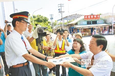 花東鐵路電氣化停靠站問題引發各地抗議,花蓮縣光復鄉長謝忠淵(圖右)4日帶領里長及代表到光復站表達訴求,並遞上陳情書。(記者楊漢聲/攝影)
