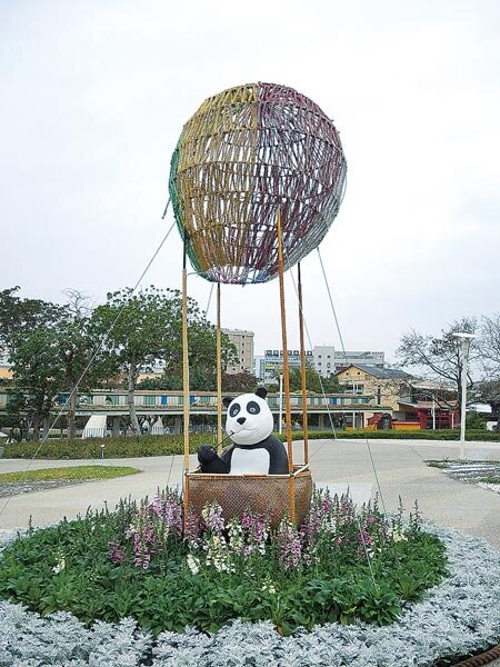 台北花卉展14日登場,今年以「魔法」為主題,園區內可見由花卉與植栽打造巫師帽、魔仗(左圖)。大貓熊也搭乘著熱氣球現身會場(上圖)。(記者張潼/攝影)
