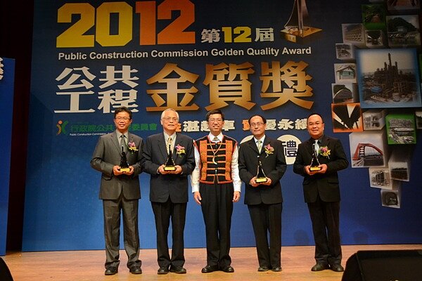 來自信義鄉東埔地區的布農族耆老們也獲邀到場為頒獎典禮進行開場表演,享譽全球的八部合音及報戰功讓全場人員讚賞不已。陳主委在啟動儀式後,逐一頒發入圍佳作及優等獎等獎項,陳副縣長、劦盛工程顧問有限公司總經理宋昌國、經理陳長廣、友山營造股份有限公司等4位分別代表日月雙橋工程主辦、規劃、監造、施工單位,上台接受頒獎,見證南投縣首座公共工程金質獎榮耀。