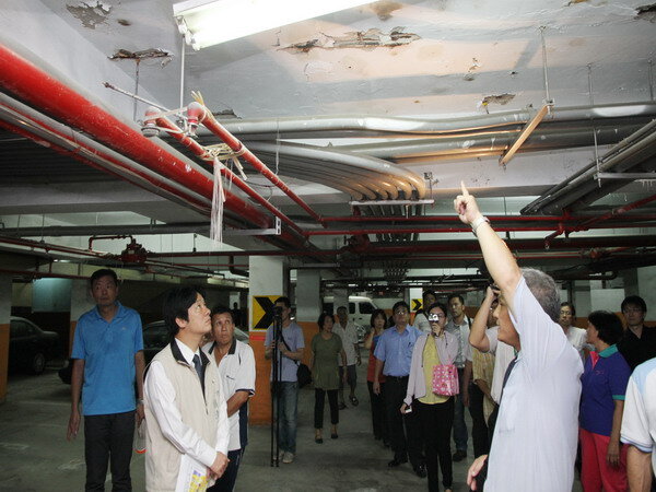 台南市安平2期國宅住家及地下停車場處處可見大片鋼筋裸露、牆壁剝落,讓住戶苦不堪言,紛向市府陳情盼能重建。市長賴清德7日前往現勘,承諾向營建署長爭取重建經費,並指示市府都市發展局協助居民蒐集資料,送監察院調查建案是否有不法之處。